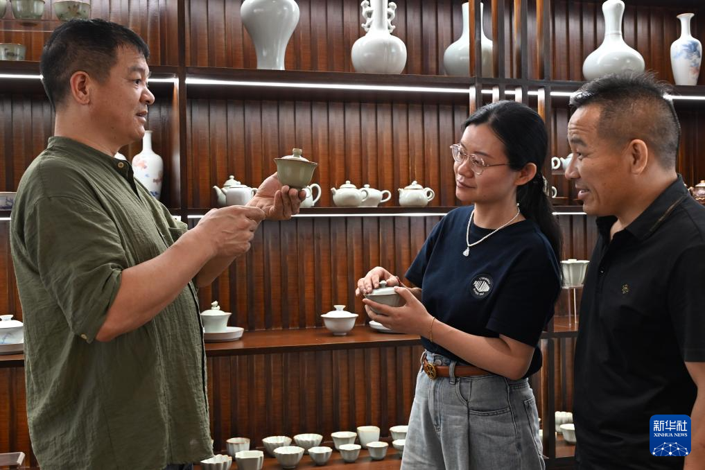 在位于江西省景德镇市善窑厂展厅里,李善明(左)在使用自制的汝瓷茶器与朋友喝茶(8月28日摄)。