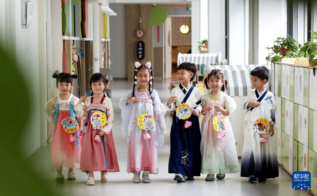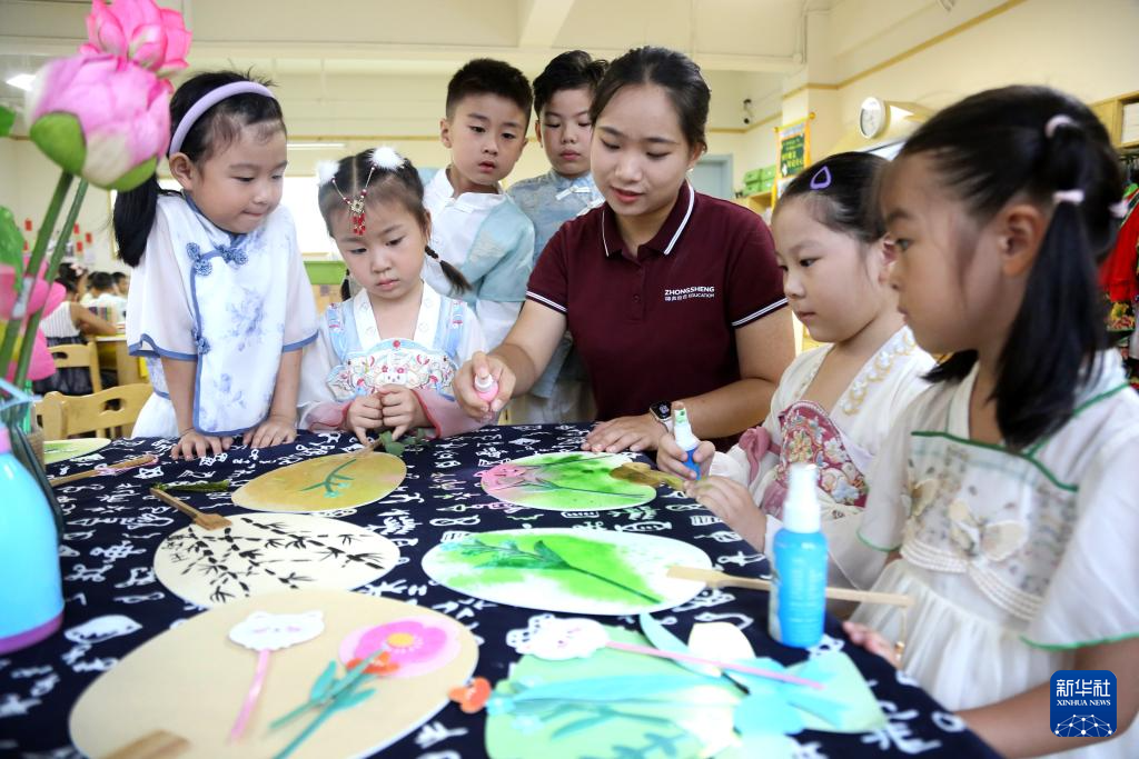 9月11日,在江苏省连云港市钟声幸福幼儿园,老师指导小朋友制作中秋团扇。