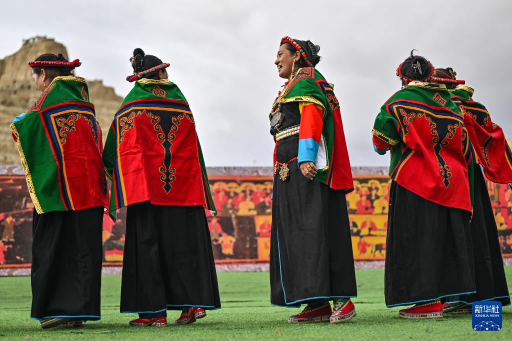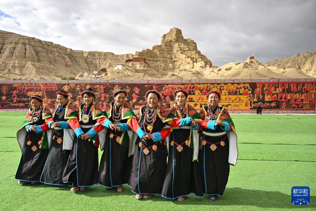 在西藏阿里地区札达县古格王国遗址脚下,当地村民表演“宣舞”(9月11日摄)。