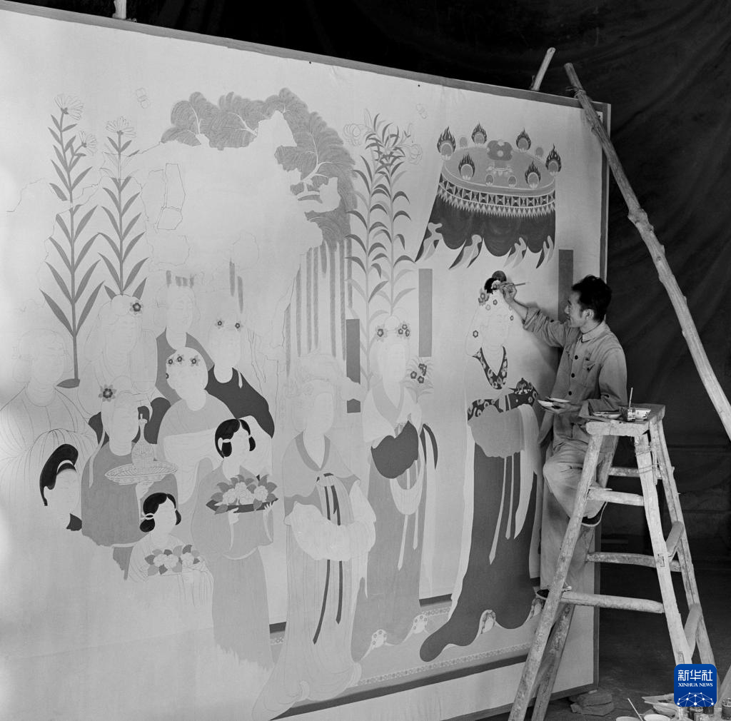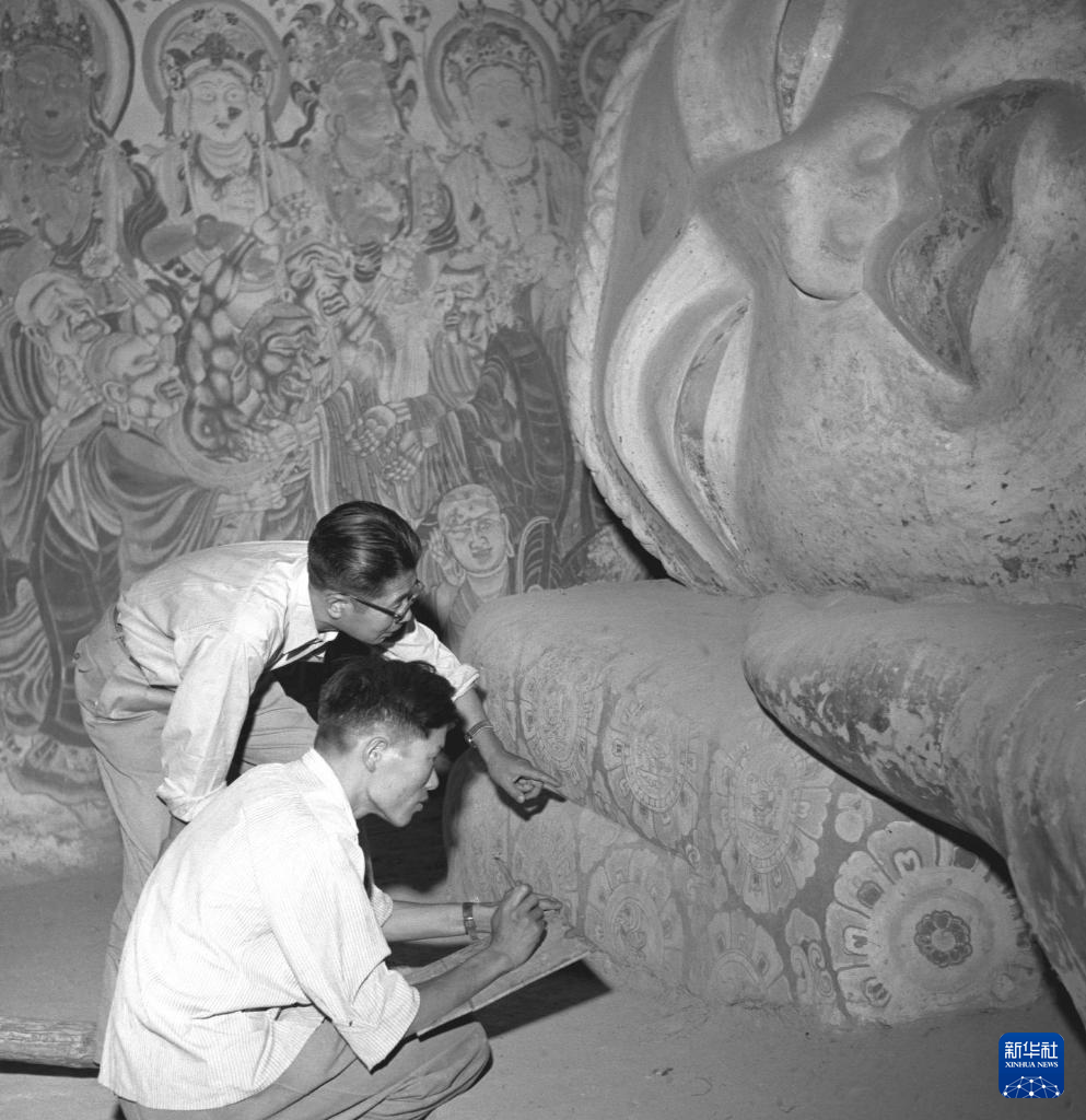 1955年7月20日,段文杰在莫高窟130窟甬道临摹壁画。新华社发(敦煌研究院供图)