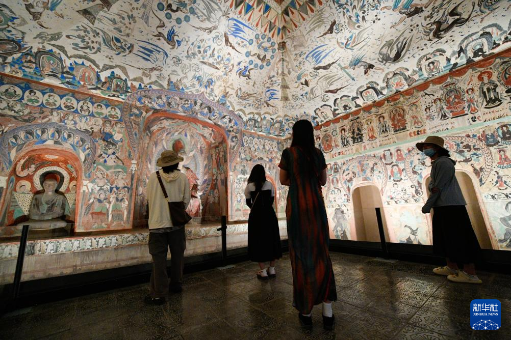 2024年6月7日,在敦煌石窟文物保护研究陈列中心,游客参观莫高窟复制洞窟第276窟壁画。新华社记者 郎兵兵 摄