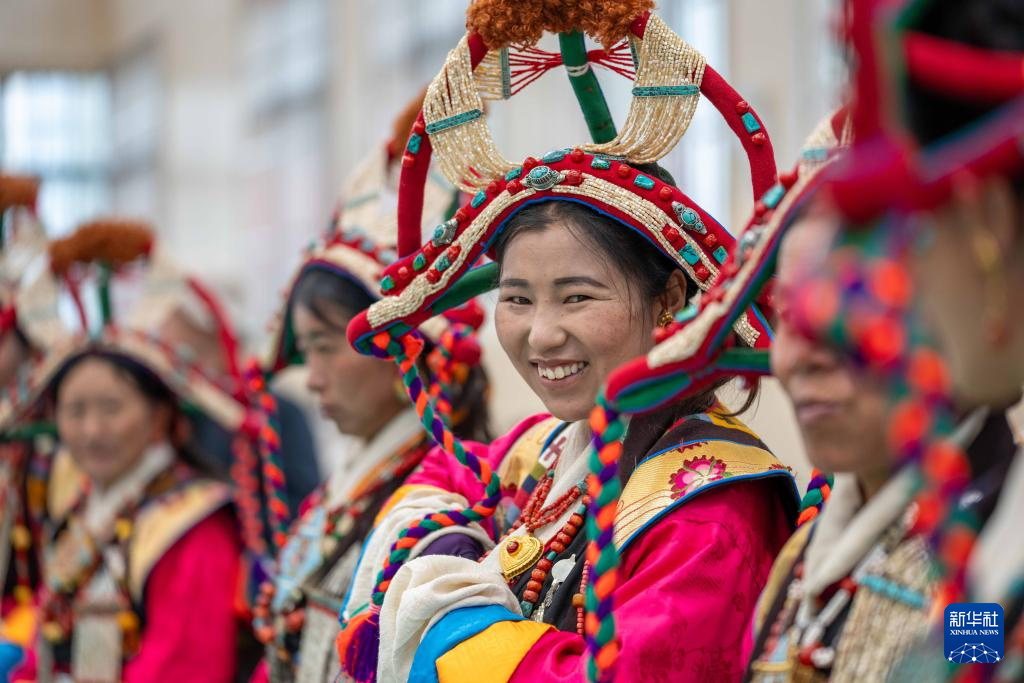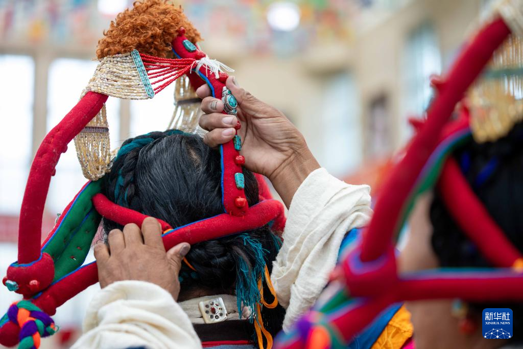 西藏日喀则市定结县,“萨尔谐钦”演职人员在整理头饰(9月25日摄)。