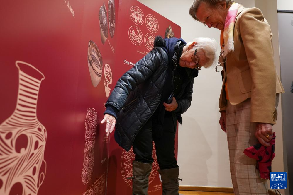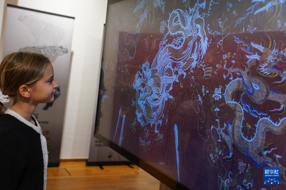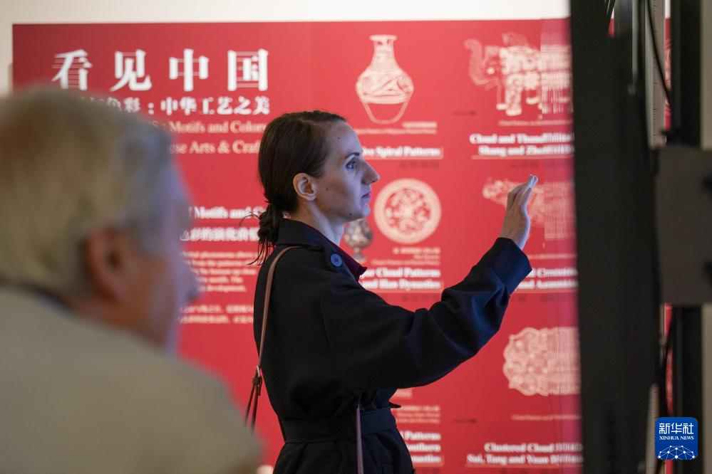 9月27日,在比利时布鲁塞尔中国文化中心,观众在“看见中国”之《纹样与色彩:中华工艺之美》数字文化展上参观。