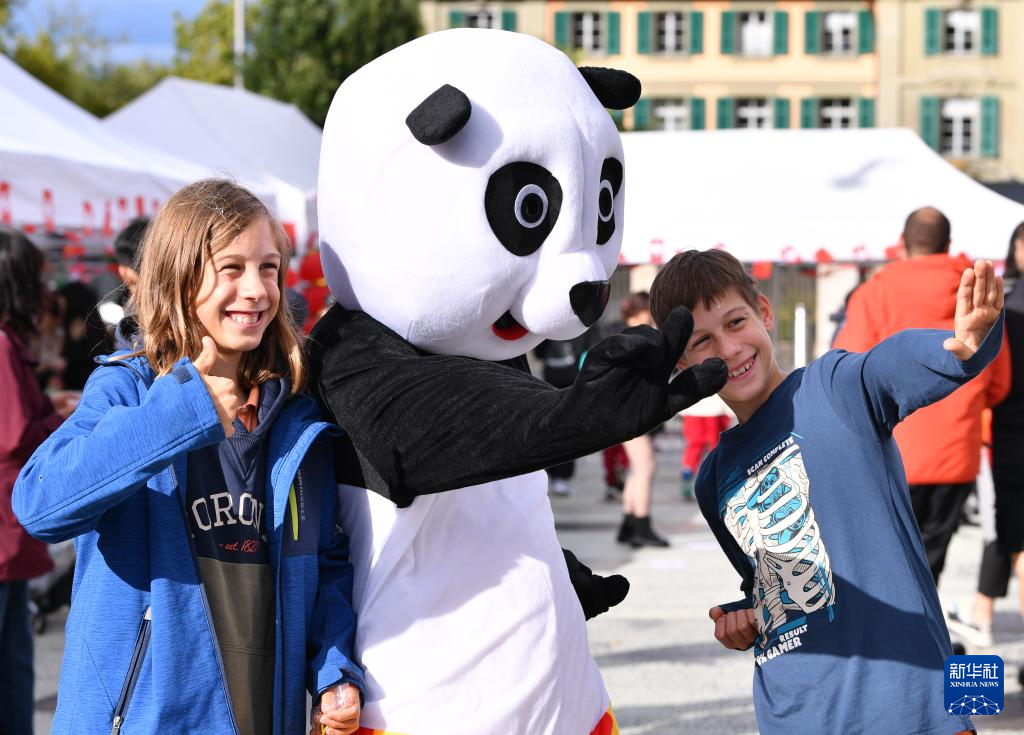 9月27日,在瑞士伯尔尼“遇见中国”文化节上,孩子们与扮成大熊猫的工作人员合影。