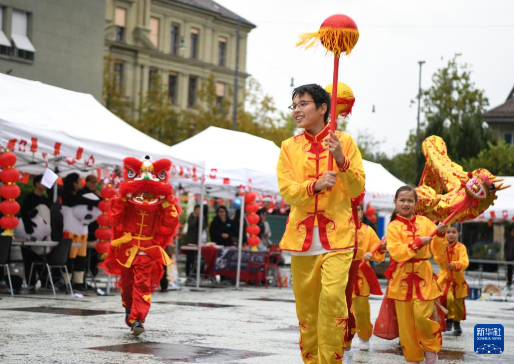 9月27日,在瑞士伯尔尼“遇见中国”文化节上,人们在雨中表演舞龙舞狮。
