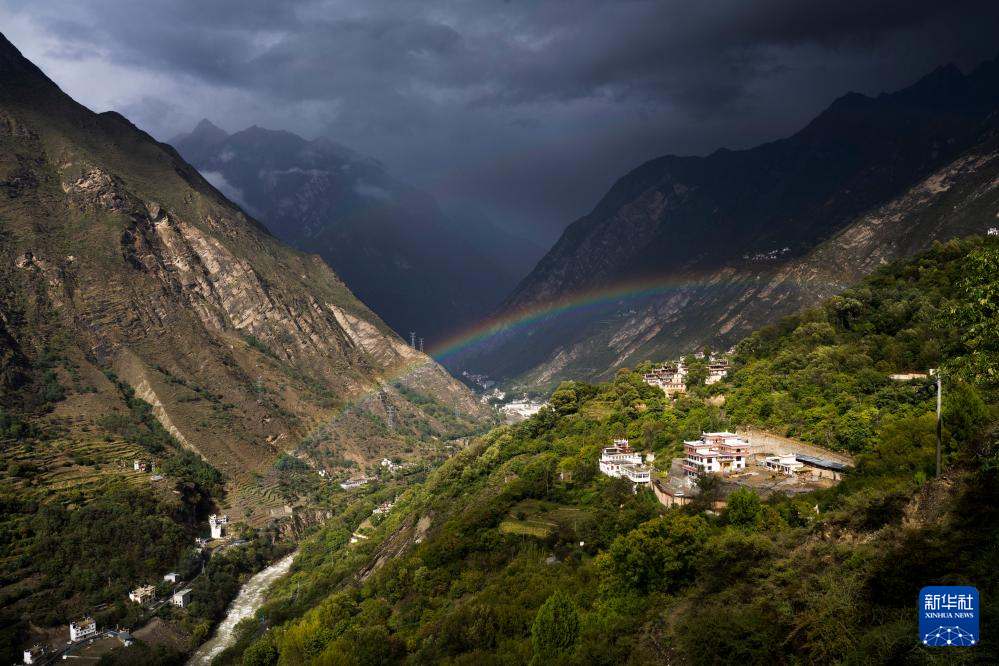 10月11日,雨后彩虹中的丹巴县中路乡藏寨。