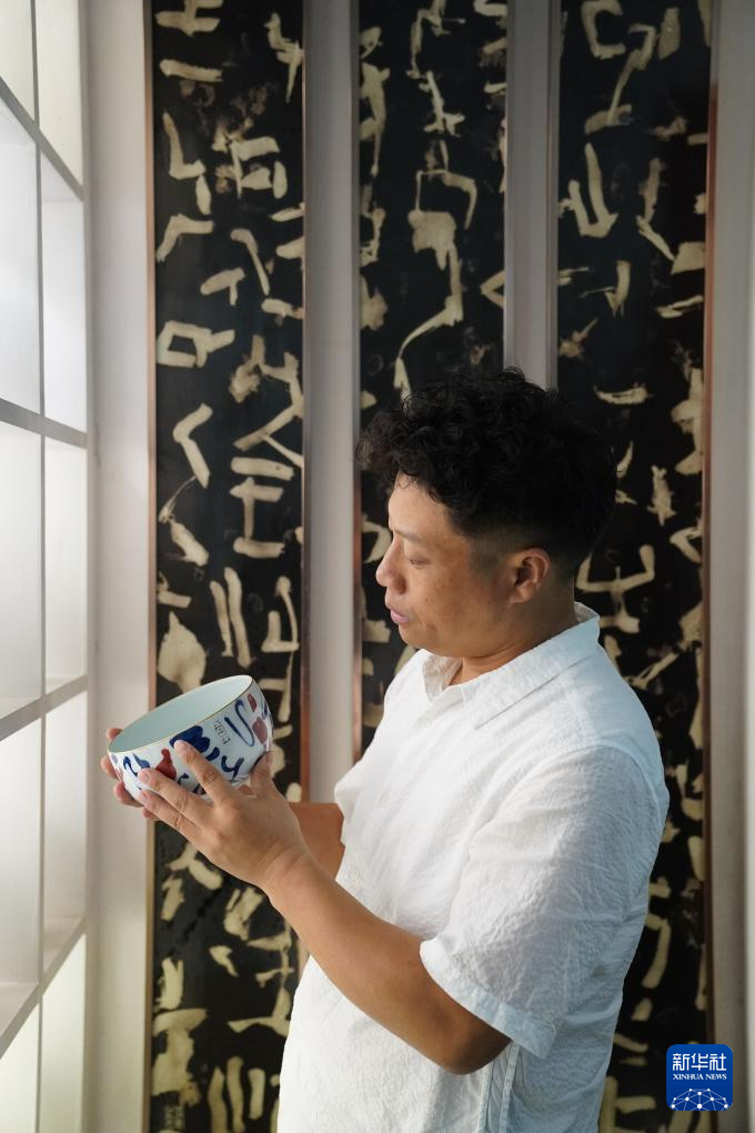 46岁的尹志军是江西陶瓷工艺美术职业技术学院教师,也是景德镇陶瓷书法非物质文化遗产代表性传承人。他将文字笔画拆解,结合色彩、设计和绘画,形成了自己独特的艺术风格。如今,尹志军创作的陶瓷书法作品已融入茶具、家居、装饰等生活用品和工艺品中,深受年轻人喜爱,作品也先后被中国工艺美术馆、江西省博物馆等收藏。