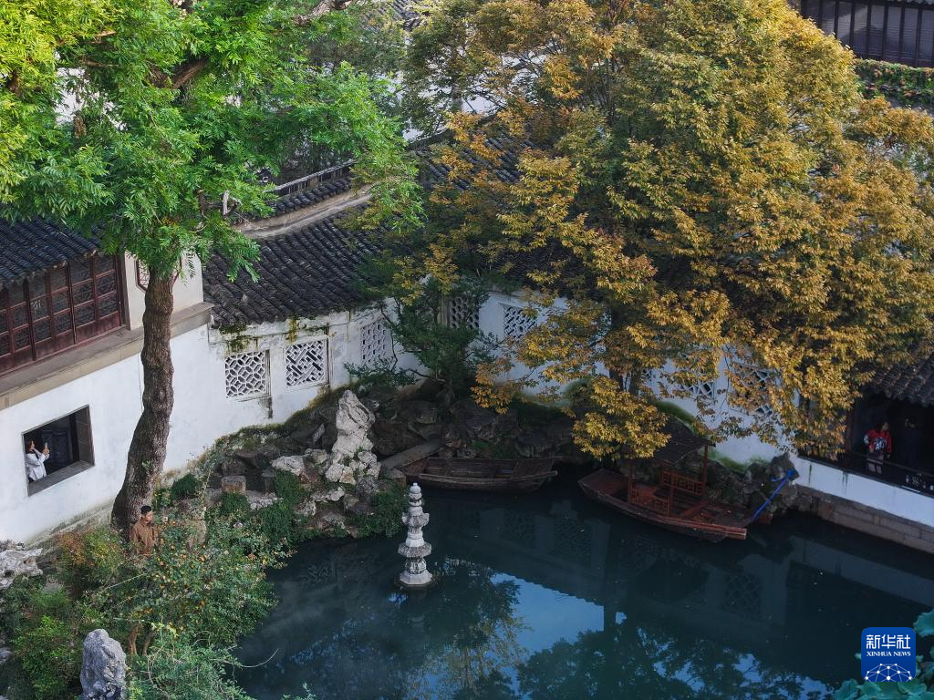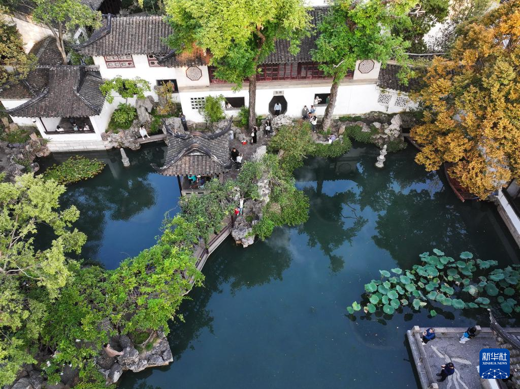 游人在拙政园内游览(10月23日摄,无人机照片)。