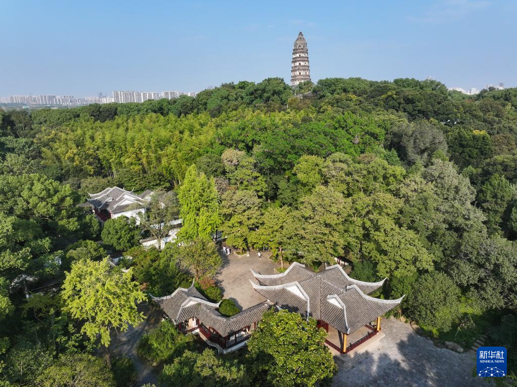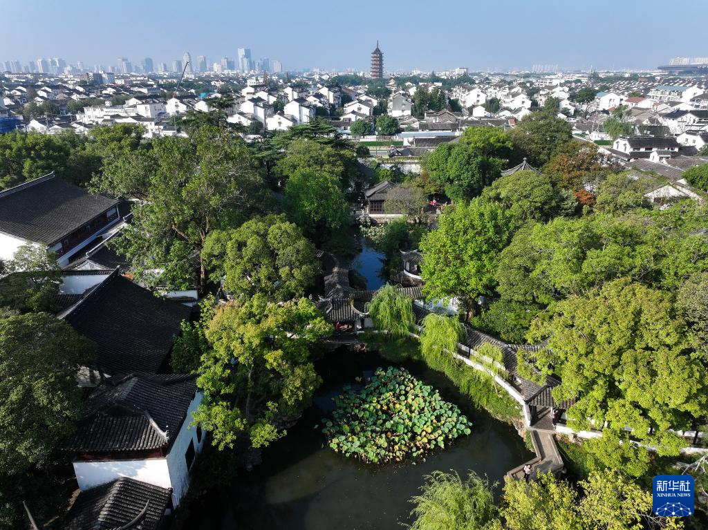 苏州园林西溪环翠游览景色(10月23日摄,无人机照片)。西溪环翠位于虎丘西南麓。