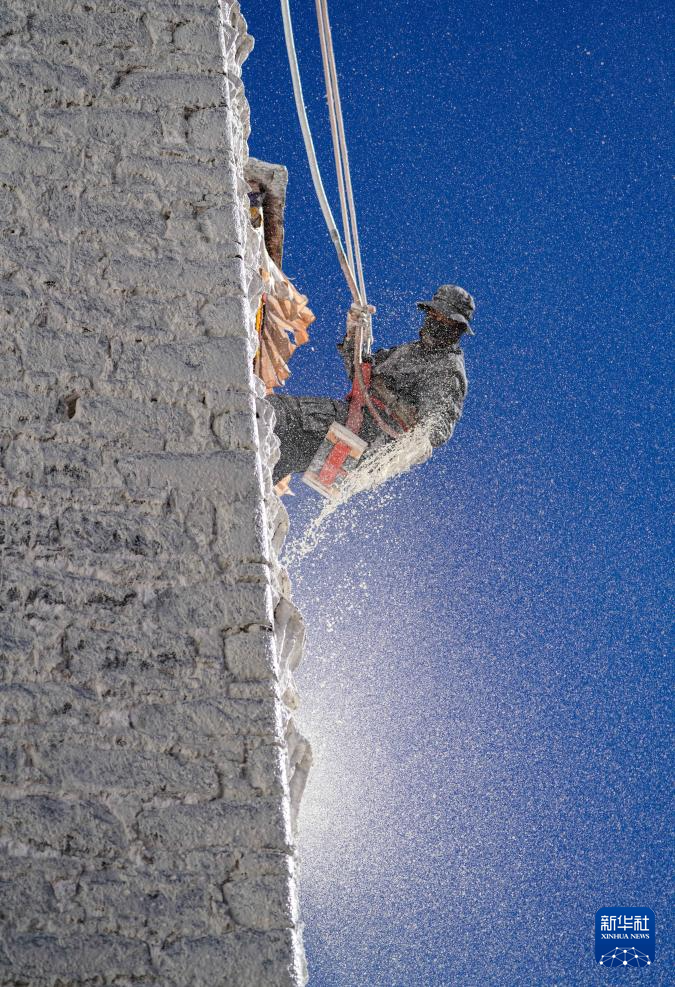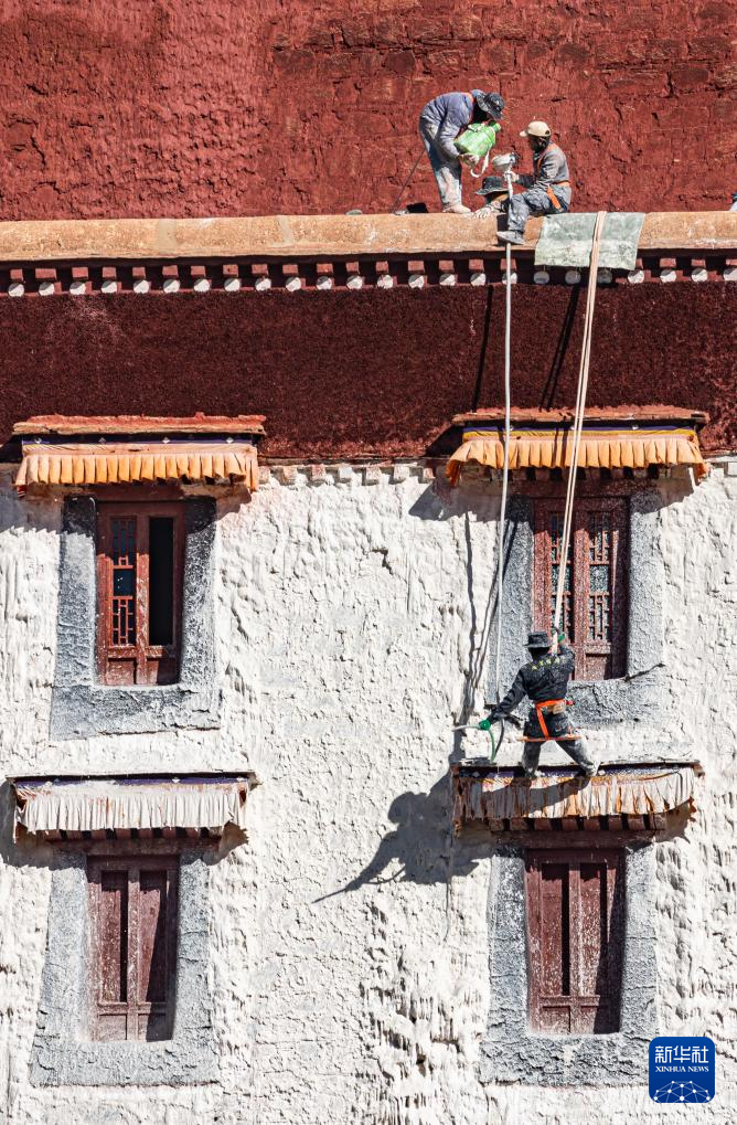10月28日,布达拉宫管理处的工作人员在喷洒涂料。