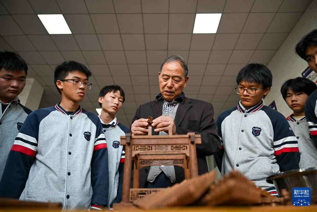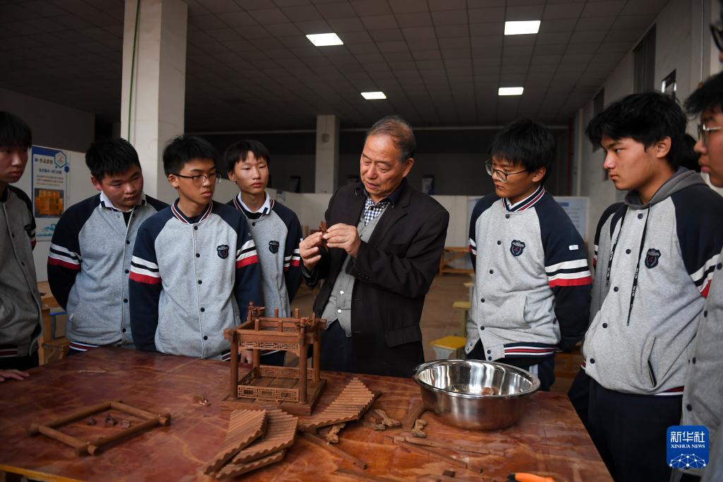 11月22日,在临海市海商职业技术学校,黄大树指导学生认识凉亭的结构。