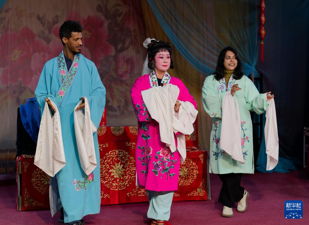 12月8日,游客在官渡古镇“古渡梨园”体验滇剧表演。