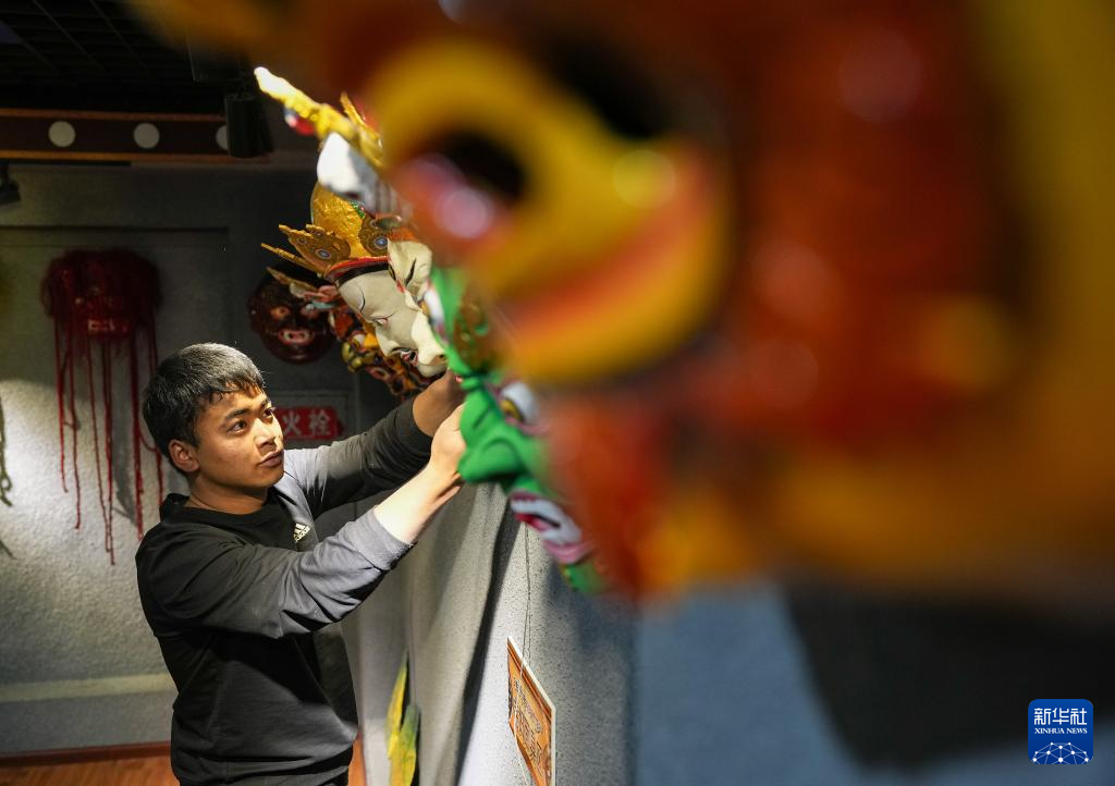 12月9日,西洛在合作社展览厅查看和同事们一起制作的西藏传统面具。