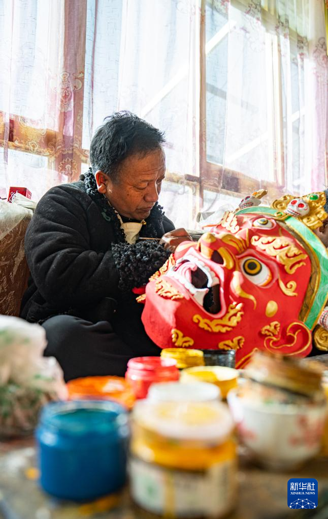12月9日,合作社的工匠在合作社门前的空地上检查做好的西藏传统面具。