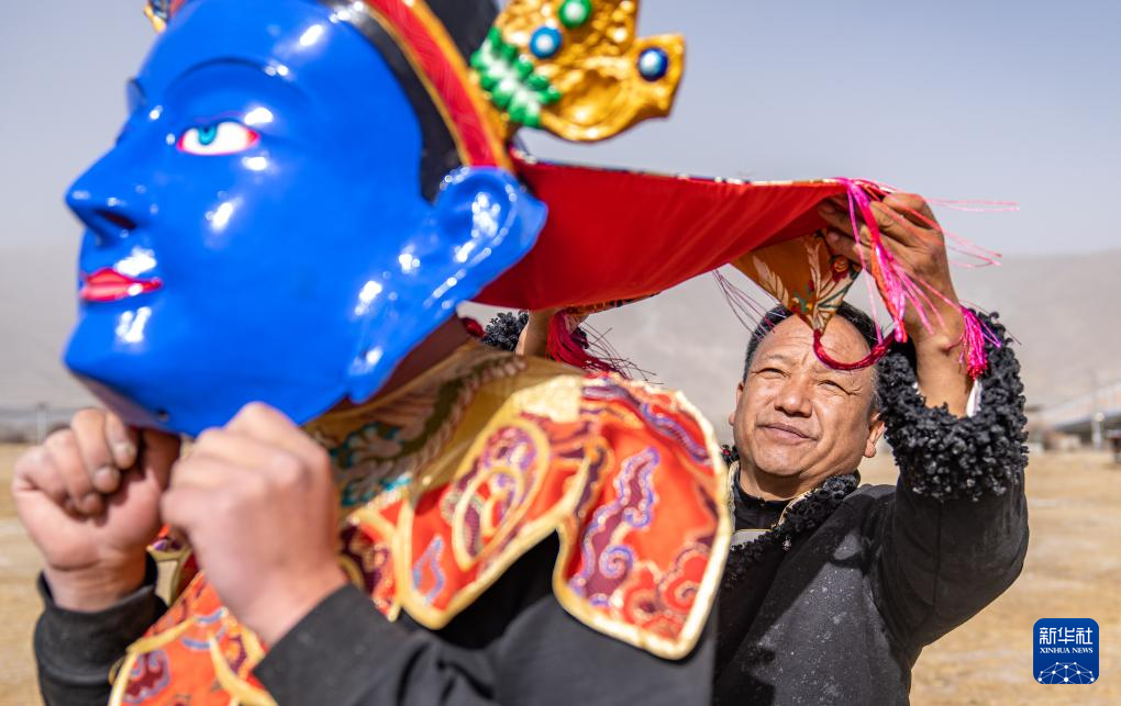 12月9日,西洛(右)在合作社门前的空地上和同事一起检查做好的西藏传统面具。