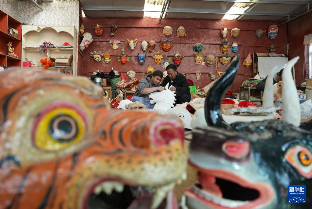 12月9日,西洛(右)和同事交流西藏传统面具制作心得。