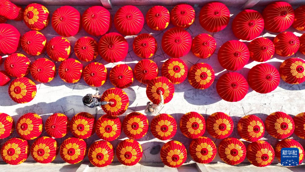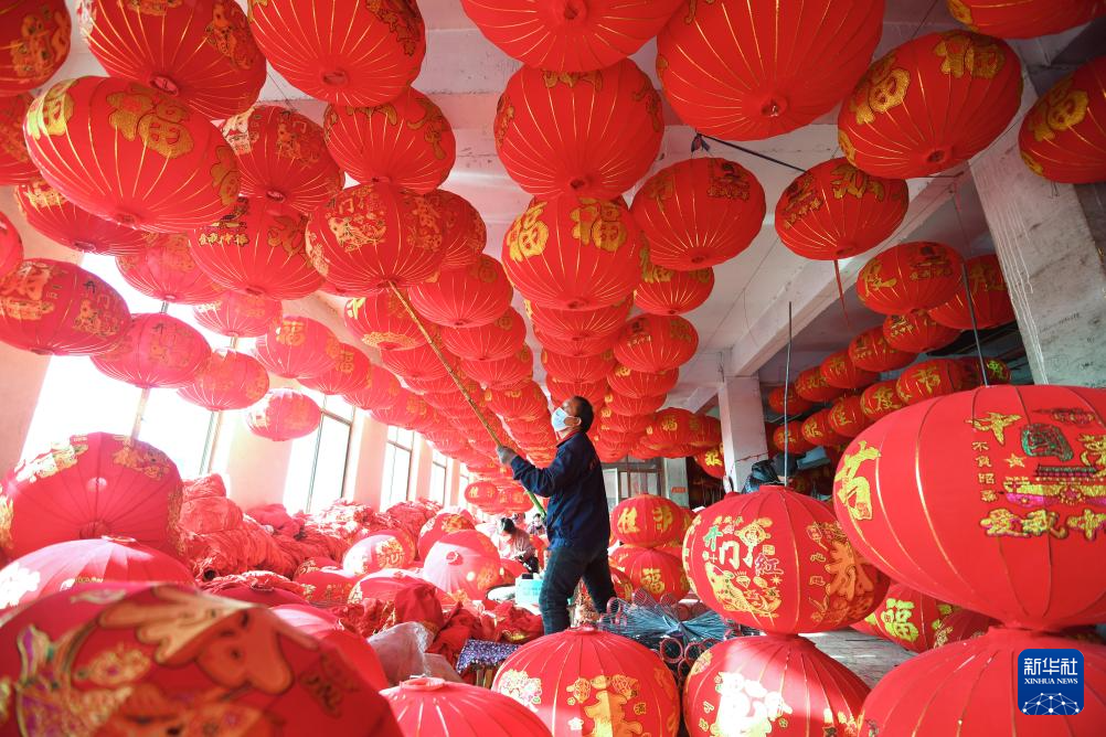 12月16日,在河北省石家庄市藁城区梅花镇屯头村一家宫灯生产厂,工人在晾晒宫灯。