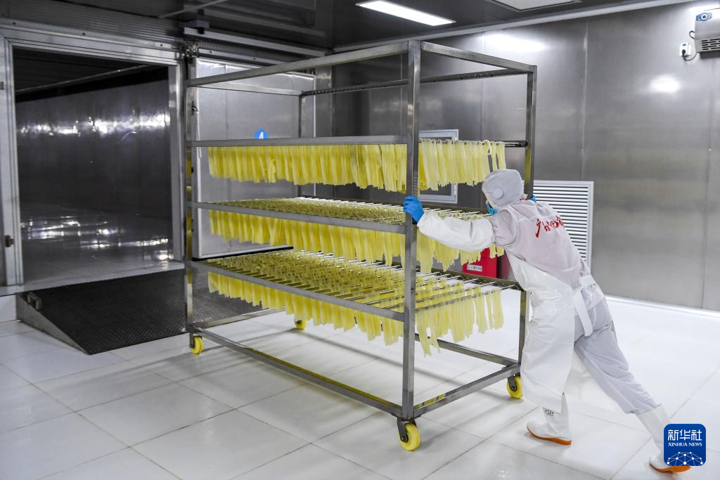 12月13日,在柳州市一家螺蛳粉生产企业,工作人员将刚刚生产出来的米粉悬挂在架子上。