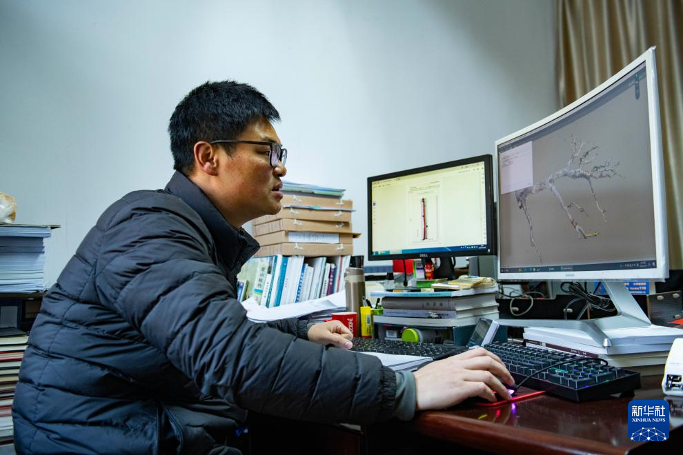 12月18日,黄山风景区管委会园林局高级工程师吴贻军在办公室里查看迎客松本体3D数字模型。