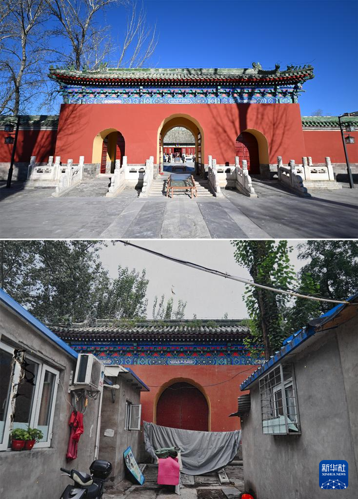 拼版照片:上图为腾退修缮后的庆成宫内宫门;下图为翻拍的庆成宫内宫门腾退修缮前的资料照片(12月21日摄)。