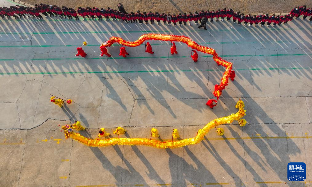 12月25日,民间艺人在河北省遵化市苏家洼镇下石河中学为学生表演舞龙(无人机照片)。