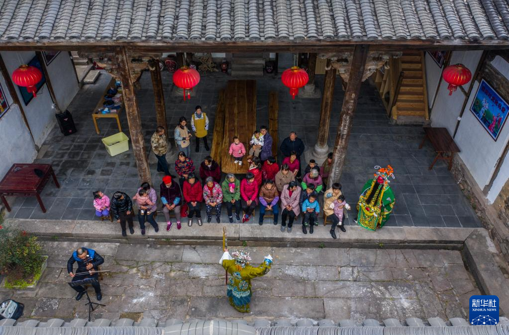 12月25日,郑店村婺剧坐唱班的演员在村文化礼堂为村民们演出(无人机照片)。