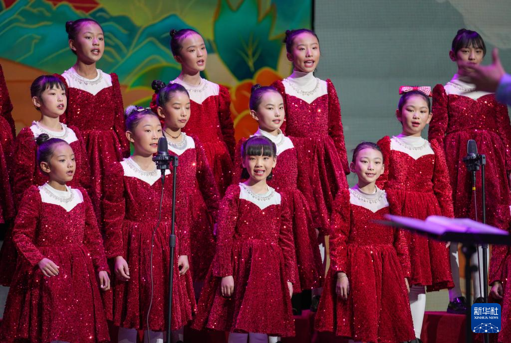 12月28日晚,西藏珠峰少年合唱团学员代表合唱歌曲《快快走唱首歌》。