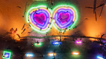 1月7日,一名游客与舞狮互动。