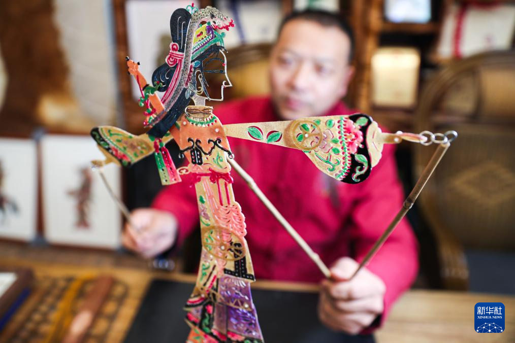 1月8日,在庆阳市环县环州故城皮影馆,环县道情皮影非遗传承人张治文检查白素贞影件的灵活度。