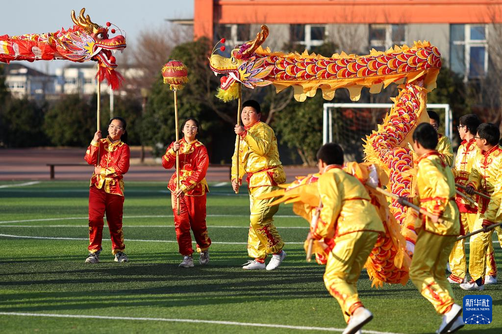 1月10日,非遗传承人在江苏省镇江句容市葛村中心小学教授学生练习舞龙技艺,带领孩子们感受传统文化魅力,迎接新春佳节。