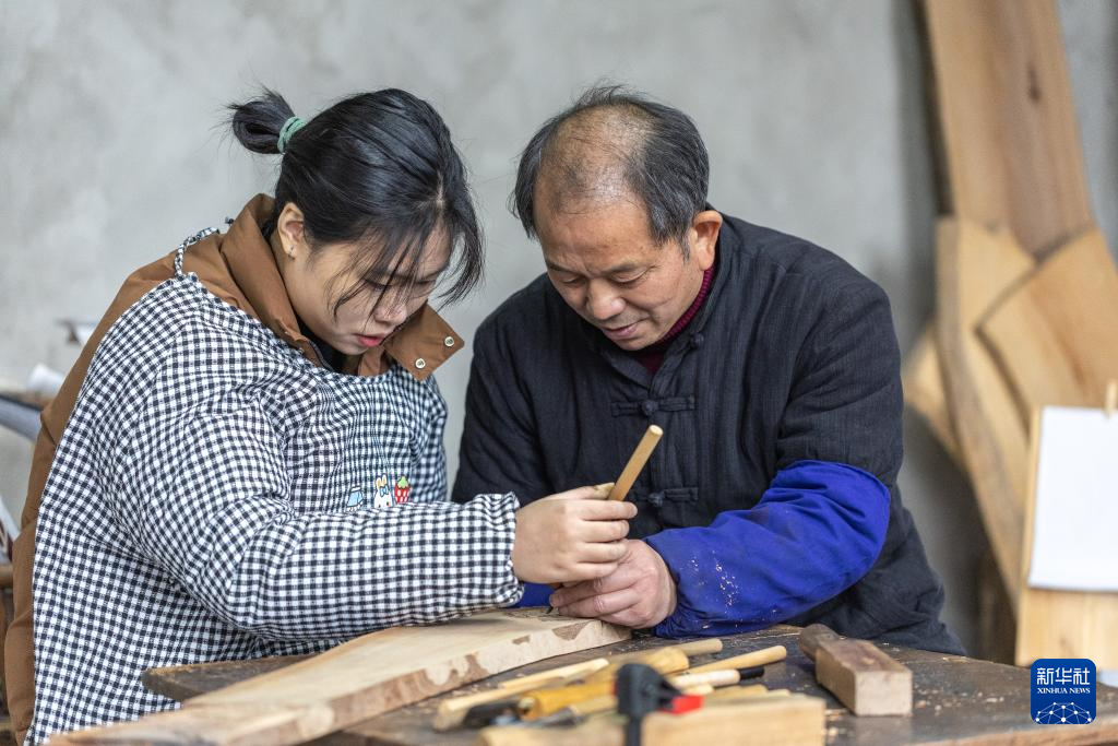 1月14日,在重庆市梁平区屏锦镇,梁平木版年画国家级代表性传承人徐家辉(右)指导学生熊彩汝梁平木版年画技艺。