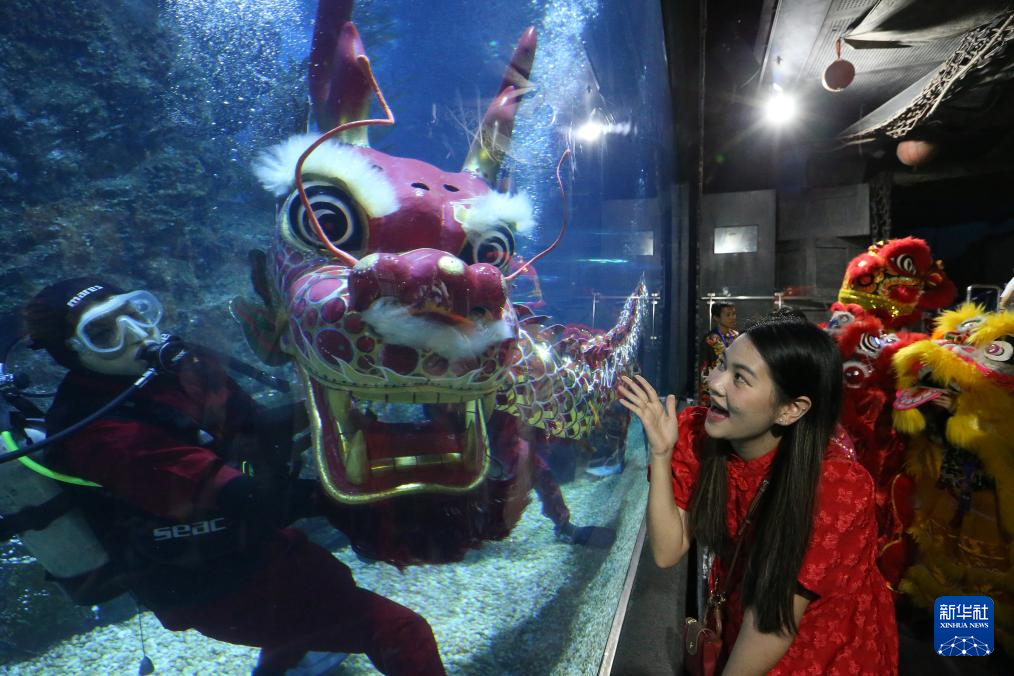 1月16日,在泰国曼谷暹罗海洋世界,潜水员在水下表演舞龙。