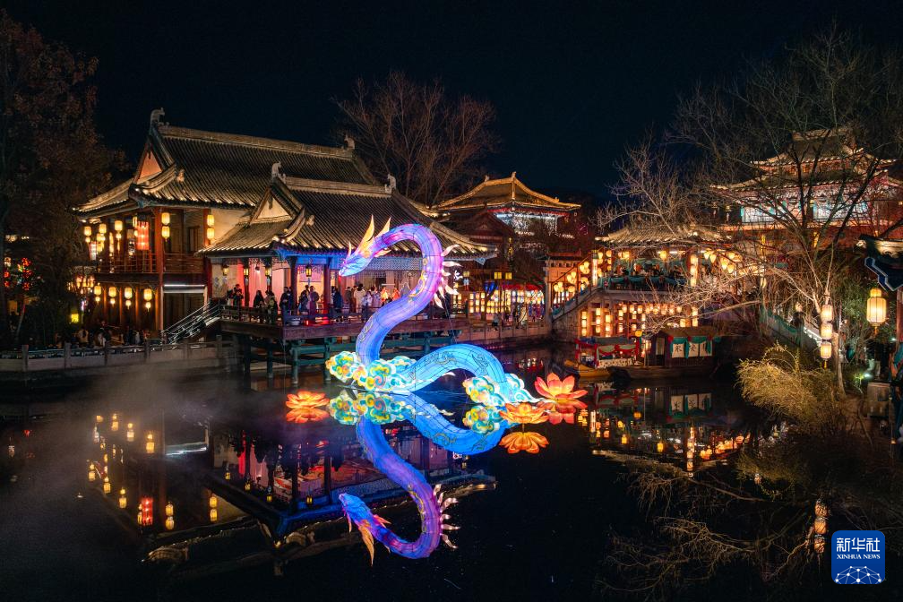 1月18日晚,河南洛阳2025年隋唐河洛文化庙会暨新春灯会试亮灯,吸引市民游客观赏。