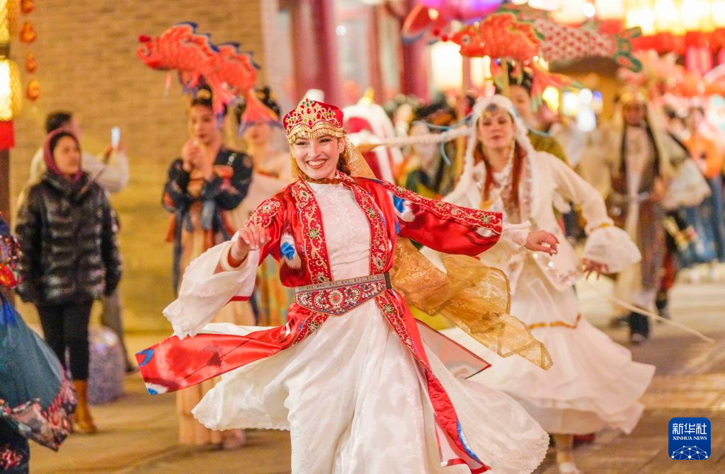 1月22日,外籍演员在河北省唐山市丰南区河头老街景区为游客演出。