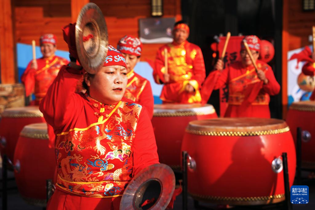 1月23日,在北京通州区台湖镇迎新春传统市集上,当地村民表演威风锣鼓。