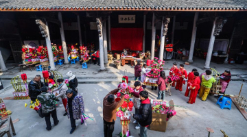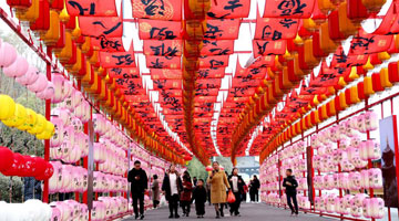 1月22日晚,游客在西安大明宫国家遗址公园灯会上逛国潮集市。