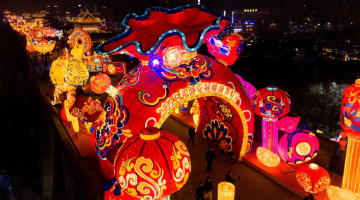 1月22日晚拍摄的西安城墙永宁门前的巨型花灯(无人机照片)。
