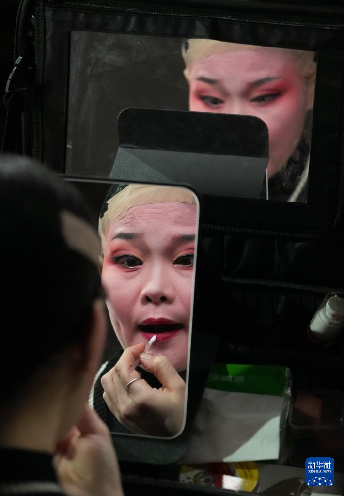 在绍兴市柯桥区夏履镇莲增村,民间越剧团晶蕾艺术团的演员在为表演越剧《五女拜寿》做准备(1月25日摄)。