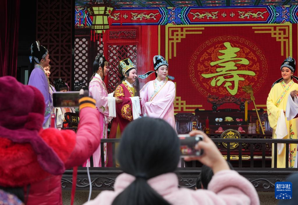 在绍兴市越城区,演员在“绍兴古城过大年”活动上表演越剧《何文秀》选段(1月29日摄)。