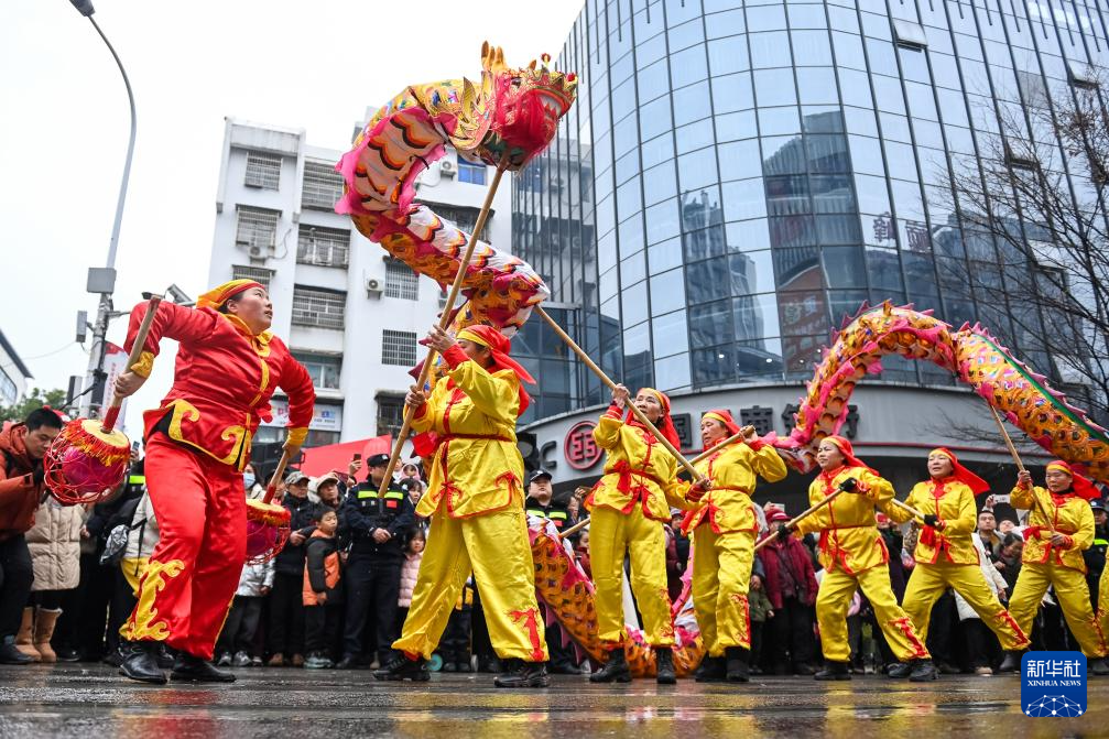 2月12日,外国留学生在张家界市永定区参与舞龙表演。