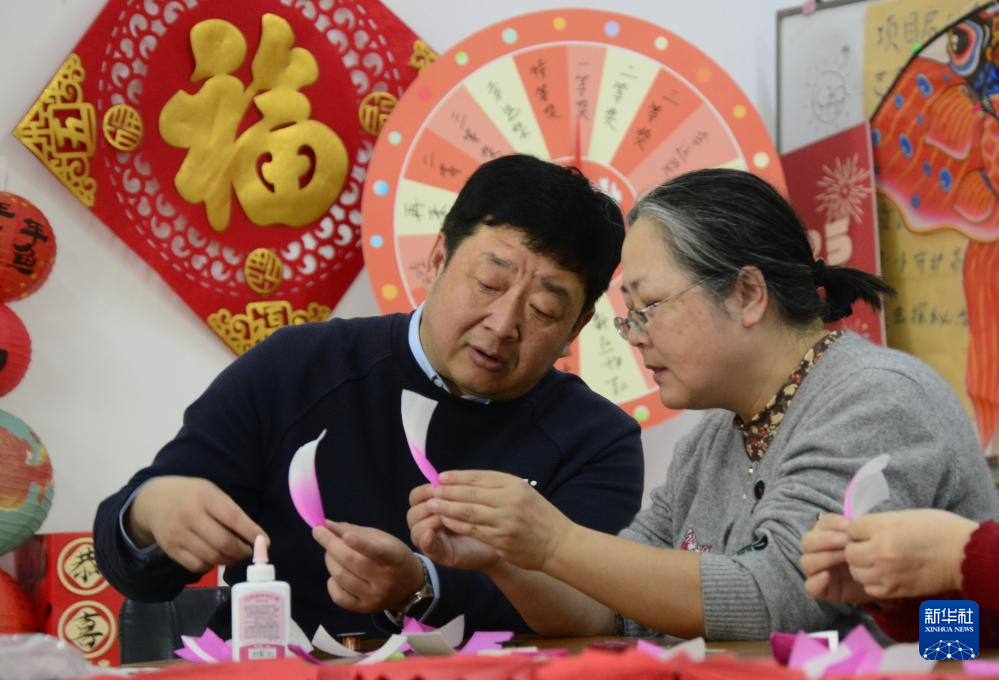 2月10日,马海捷(左)在朝阳区安贞街道残疾人职康站培训工作人员制作灯彩。