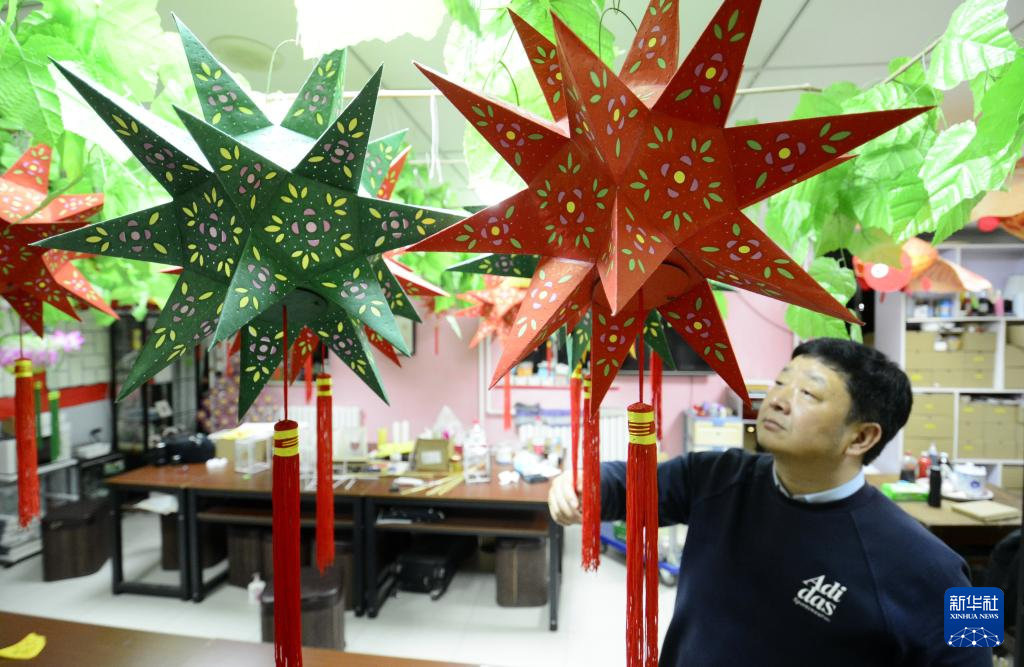 马海捷工作室内挂满了他制作的灯彩(2月10日摄)。