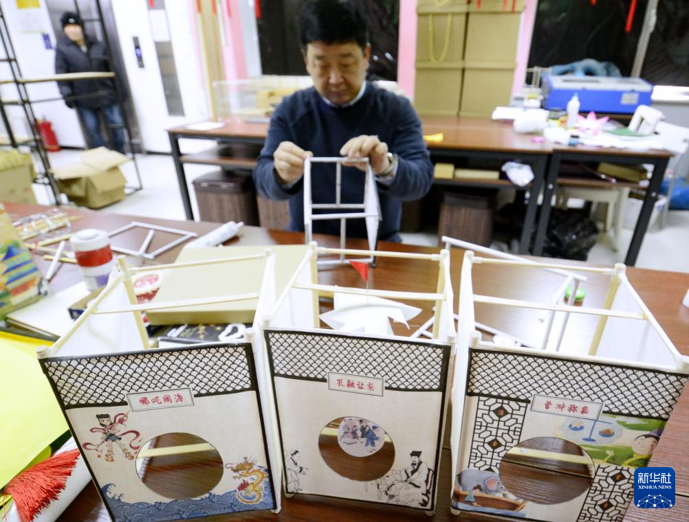 2月10日,马海捷在制作绘有传统故事图案的灯彩。