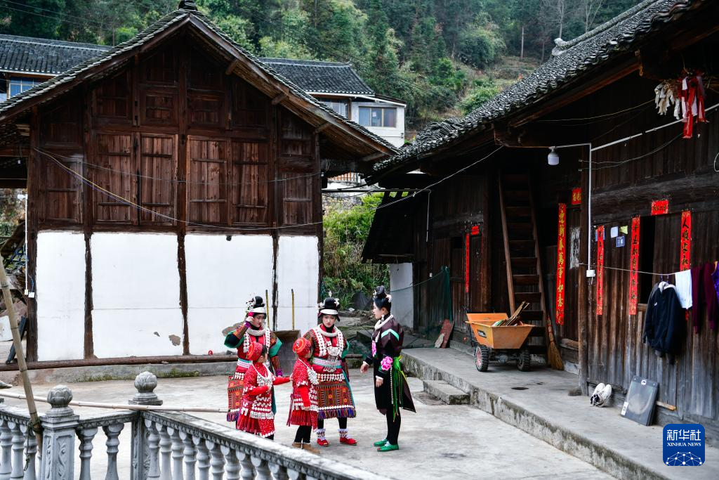 在贵州省凯里市舟溪镇舟溪村茶林苗寨,长辈在帮助双胞胎姐妹杨柠羽(左一)、杨柠竹(左三)穿戴苗族盛装(2月15日摄)。