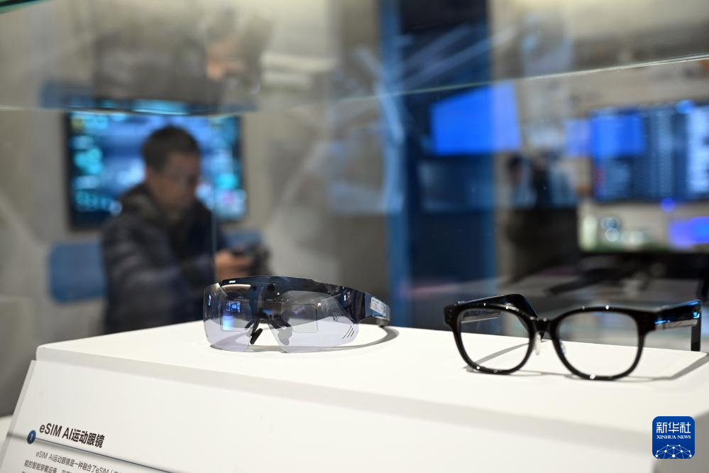这是2月20日在网络发展新图景成就展上拍摄的AI运动眼镜。