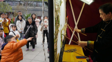 3月19日,在任炜汉绣工作室附近的公园里,汉绣爱好者在观看任炜汉绣工作室的汉绣作品。