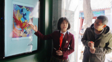 3月24日,府学胡同小学学生在书画摄影展开幕式上展示手工作品。