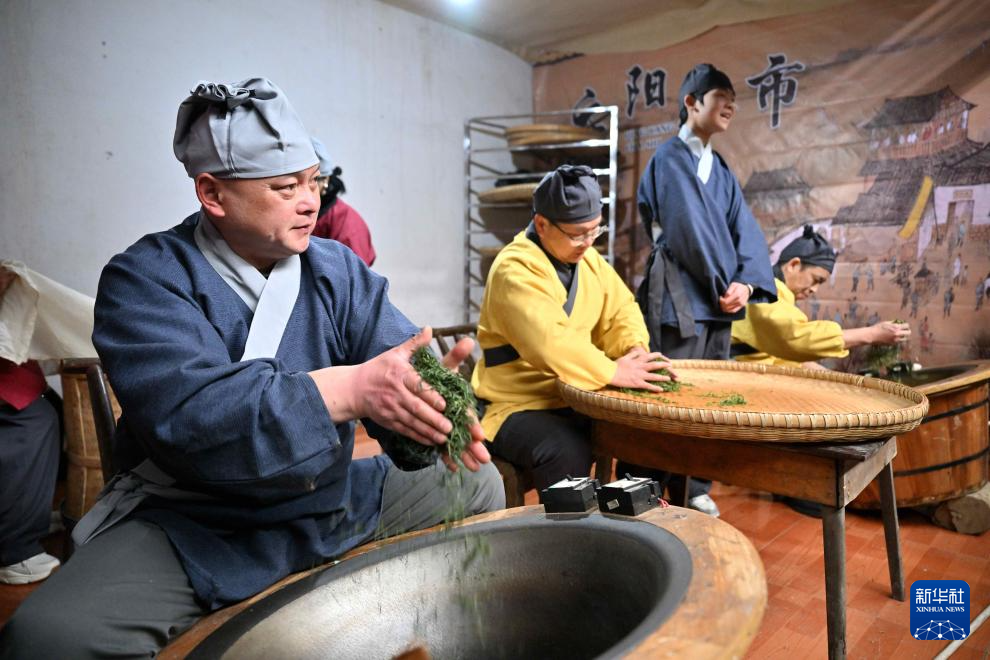 3月30日,村民在湖宣恩县椒园镇庆阳古街表演手工制茶。