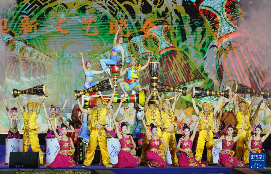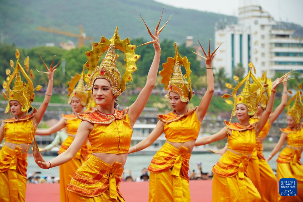 4月12日,在西双版纳傣族自治州景洪市,演员在傣历新年节(2025年泼水节)文艺晚会上表演。