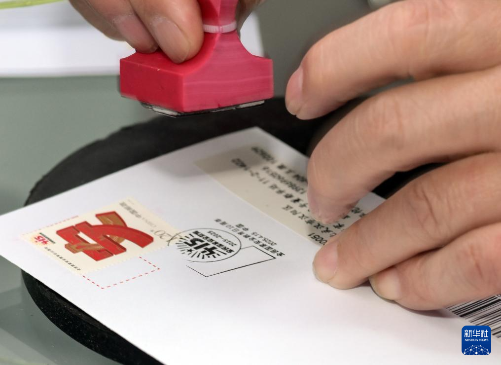 4月15日,在北京市西城区集邮营业厅,集邮爱好者在其购买的《全民国家安全教育日10周年》首日封上加盖主题纪念邮戳。
